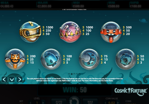Игровой 3d автомат Космическая Фортуна онлайн это уникальная слот-машина с 3D графикой, из-за исчезающих комбинаций он несколько напоминает Gonzo's Quest. То есть, каждый раз, когда на барабанах выпадает цепочка из одинаковых символов, она сгорает, а ее место занимают находящиеся сверху символы, с возможностью создания новой цепочки, что можно увидеть на лудоводе под описанием. Количество линий аппарата – 15, их число нельзя поменять, а вот изменить ставку вполне реально, как и ее номинал. Демо режим позволяет опробовать автомат Cosmic Fortune бесплатно, а на SlotsV не требуется и регистрация или отправка смс.