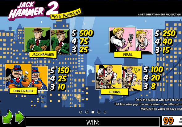 Самый дорогой символ аппарата Jack Hammer 2 это изображение с главным героем – Джеком Хаммером. Три таких символа увеличат ставку на линию в 25 раз, 4 изображения принесут в копилку уже 75 ставок, а полная линия детективов выдаст максимально возможную сумму, равную пятистам ставкам.