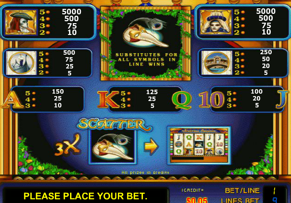 Венецианский Карнавал это самое старое костюмированное шоу, которое проводится в наши дни, с первого его проведения прошло уже более тысячи лет. Конечно, компания Гейминатор просто не могла обойти стороной это событие и посвятила ему сюжет игрового автомата Venetian Carnival с уникальной бонусной игрой, любителям тематических исторических аппаратов также рекомендуем такие автоматы как Марко Поло и Колумб. Чтобы погрузиться в атмосферу безудержного веселья и неистовых плясок Вам достаточно дождаться загрузки игры в свой браузер, так что можно начинать вращать барабаны прямо сейчас, без пополнения счета и отправки смс.