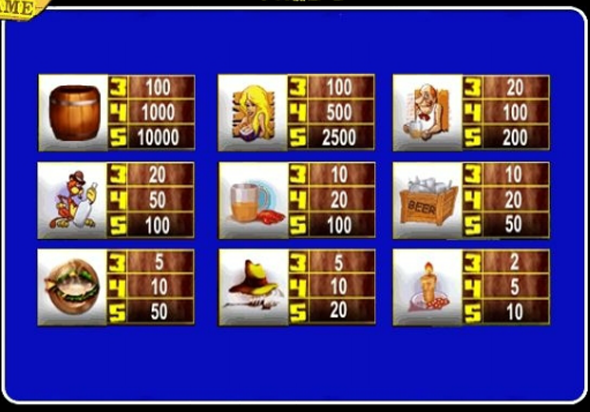 Самый дорогой символ в игровом автомате Lucky Drink изображение бочки с виски. Счастливчику обнаружившему пять таких изображений на своем игровом экране сулит выиграть Джек пот, это значит, что его ставка умножается в 10000 раз. Четыре символа в 1000 раз, а совпадение троих символов численностью в три изображения увеличивает ставку в 100 раз.