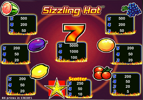 Звездам в игровом автомате Sizzling Hot отдана важная роль скаттеров – символов, которые играют вне зависимости от месторасположения на игровых линиях и барабанах. Три Звезды увеличат Вашу ставку на линию в 10 раз, четыре – в 50, а пять в 250 раз, выигрышная комбинация тут же загорится жарким огнем.