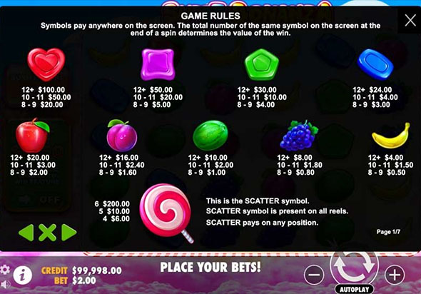 В игре присутствуют различные символы, включая яркие фрукты и сладости. Наибольшие выигрыши приносят символы леденцов и конфет. Также стоит обратить внимание на бонусные символы, которые могут активировать бесплатные вращения и дополнительные функции.
