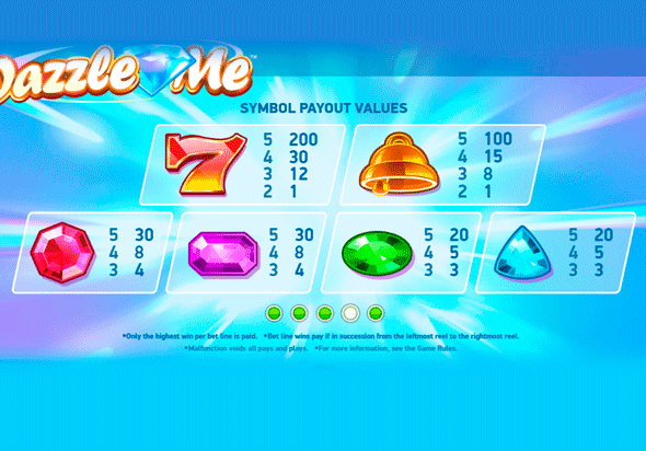 Оригинальный азартный слот Dazzle Me от компании Net Entertainment отличается отсутствием конкретной тематики, что абсолютно не снижает его привлекательности для гемблеров. Красочный дизайн ставит его в один ряд с такими шедеврами графики от шведского разработчика как Гонзо Квест. Но здесь вас встретит игровое поле из 5-и барабанов и целых 76 игровых линий, количество которых менять нельзя. К тому же барабаны выглядят не совсем стандартно: на первых двух барабанах расположены три символа, на третьем и четвёртом - четыре, и только на пятом вы увидите сразу пять позиций. Для большего удобства гемблер может выбрать игру на максимальной ставке или в автоматическом режиме с регулировкой количества спинов.