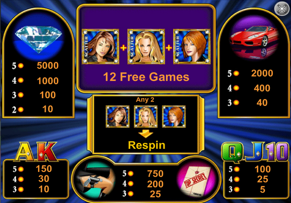 В игровом аппарате Diamond Trio, три диких символа и три скаттера, они объединились в изображениях трёх очаровательных шпионок, брюнетку, блондинку и рыжую, которые выпадают каждая на своем барабане. Появление их троих, даёт вам 12 бесплатных спинов. Если выпали две красавицы, то барабан, на котором должна быть третья прокрутится еще раз бесплатно.