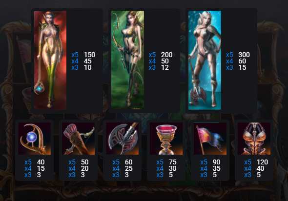 Ключевой особенностью Elven Princesses можно назвать достаточно большой диапазон ставок. На каждую из 40 активных линий игрок может поставить от $0,20 до $1. При этом даже если крутитьпо минимальным ставкам все равно есть большая вероятность заработать большие деньги. Максимальный выигрыш здесь составляет х4000, но выпадет только если пользователь решил сделать самую большую ставку на все линии. Естественно, ваша удача в этой ситуации будет играть очень важную роль и только она решит повезет вам с деньгами или нет. Что касается изображений, которые представлены в игровом аппарате, то выделить стоит: