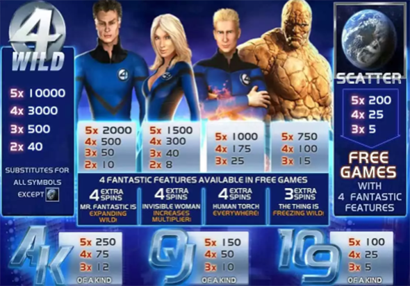 На деле виртуальный слот Фантастическая Четверка оказывается классическим автоматом на 20 выигрышных линий. Здесь также, как и везде есть 5 барабанов и достаточно много разнообразных символов. Минимальная ставка составляет 1 кредит, а максимальная может быть 20. Если пользователь хочет потратить весь свой депозит на игру, то сможет выиграть в результате целых 10 000. Слот достаточно щедрый и поэтому привлекает большое количество азартных игроков. Высокие выигрыши здесь готовы предоставить основные символы: