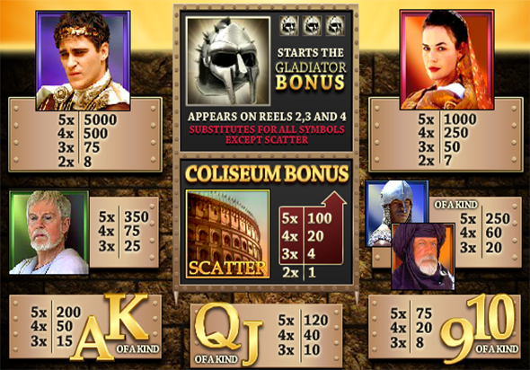 Достаточно часто на барабанах можно встретить изображение Колизея, которое здесь в роли скаттера. Они нужны для того, чтобы переместиться в специальный бонусный уровень. Достаточно собрать 3 таких изображения и автомат пропустим пользователя в «Coliseum bouns». Также особо внимания заслуживает символ Гладиаторского шлема. Он здесь дикий, а это значит, что способен заменить собой другие изображения на выигрышных линиях и тем самым завершить их.