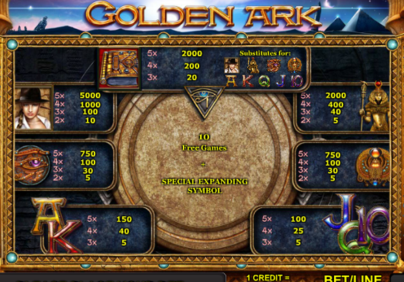Аппарат Golden Ark оснащен новой, рассчитанной на интернет пользователей панелью, разобраться в которой не составит труда. Чтобы установить до 10 активных линий нажимайте на знаки + и – в окошке «Lines», ставку – такими же + и – в окошке «Bet/Line». Запускать барабаны нужно кнопкой «Start», а чтобы делать это в автоматическом режиме нажмите «Autoplay». Символы складываются в цепочки по общепринятому принципу, начиная с первого барабана, стоимость их можно увидеть, нажав «Paytable».