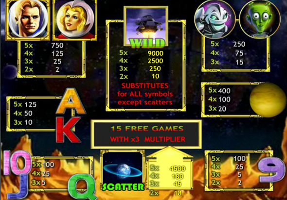 На втором месте по выдаче кредитов, символ с планетой с кольцом из астероидов, это скаттер, то есть он может совпадать вразброс. Кроме неплохих кредитов на счет, до 4500 раз превышающих ставку 3, 4 или 5 таких изображений принесут серию из 15 бесплатных вращений барабанов, весь выигрыш в которых увеличится втрое.