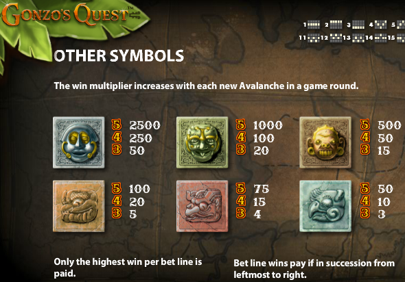 Принцип составления комбинаций в Гонзо Квест бесплатно уникален и напоминает игру «Тетрис». При выпадении выигрышной комбинации выпавшие символы сгорают, и их место заполняют новые. При этом коэффициент на выигрышную сумму увеличивается с 1-го до 2-х, следующая комбинация увеличит его до 3-х и так до 5-ти. Если комбинация не выпала, коэффициент снова становиться 1.