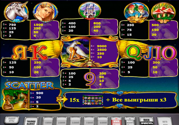 Волшебная роща, в которой обитают все вышеперечисленные существа, является символом разброса или скаттером – эти символы составят комбинации в любом расположении на экране. Кроме кредитов 3-5 этих изображений запустят серии из 15 бесплатных ходов (фриспинов), с троекратным увеличением всех полученных в ходе них кредитов.