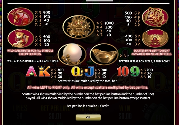Тема восточной культуры прослеживается во всех символах, которые падают на барабанах. Всего барабанов 5, а линий для выигрыша 25. Среди символов присутствующих в 50 Dragons стоит выделить: