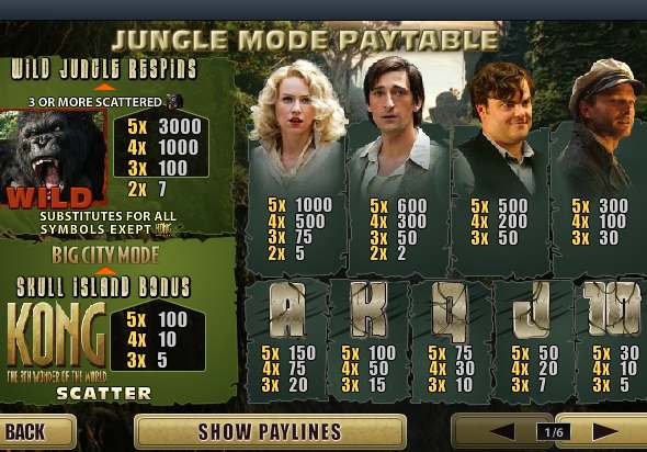 Наверняка, практически нет тех кто ничего не слышал про Кинг Конга. Этот персонаж был одним из первых в жанре фантастики и кто-то до сих пор думает, что огромная, умная обезьяна действительно существует. Конечно же это не правда, но образ настолько внушительный и запоминающийся, что с момента появления его еще на протяжении десятка лет используют практически везде. Представленный игровой автомат King Kong не стал исключением и если вы поклонник подобной тематики или просто любите много выигрывать, то попробовать сыграть в игровые автоматы Кинг Конг онлайн бесплатно и без регистрации однозначно стоит. Как минимум, вы будете в восторге от здешнего оформления.