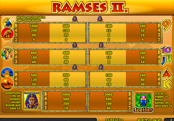 Там где пустыня простирается от края до края, светит вечное неутомимое солнце, родился величественный правитель этих земель. Он строил множество храмов и возводил себе статуи, которые и по сей день остаются достопримечательностями Египта. Игровой автомат Рамзес 2 проведет счастливчиков по древним тропам к несметным богатствам древнего царя, где Фараон Рамзес читает Книгу Ра и испытает интуицию каждого, кто рискнет с ним сыграть. Испытайте и Вы свою удачу в демо версии аппарата бесплатно и без рекламы.