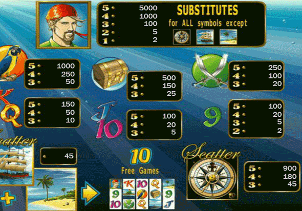Символ с изображением компаса играет роль символа разброса, скаттера, это означает, что он может играть, даже если выпадет не по линиям. Так же в игре есть дополнительные скаттеры – корабль и остров, которые выпадают только на первом и пятом барабанах и, совпав одновременно, запускают серию из 10 бесплатных ходов, в которых отважный рыбак переправляется по морю, кишащему акулами, заменяя собой символы в выпадающих комбинациях.
