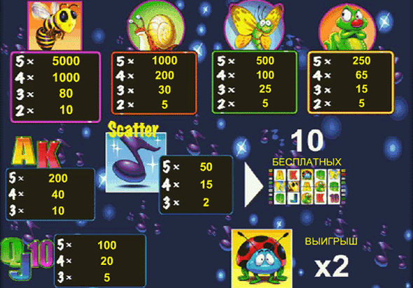 Есть аппараты, которые просто излучают позитив и хорошее настроение и онлайн игровой автомат Жуки как раз из их числа. Просто невозможно не улыбнуться, когда смотришь на его мелких обитателей – сердитую гусеницу, грозную осу и глупую божью коровку и звуки, сопровождающие игровой процесс, также поднимают настроение. Оценить все прелести этого «музыкального» автомата можно совершенно бесплатно в любое время, не вставая из-за компьютера. Очень интересно играть в паре с автоматом Secret Forest от той же компании Гаминатор