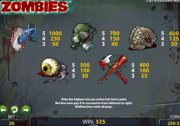 Самый дорогой символ в игровом автомате Зомби онлайн это изображение предмета, который лучше всего подходит для расчленения мертвецов – болгарки. Ее стоимость варьируется от 50-кратного увеличения ставки за три и до 1000-кратного за пять ее изображений. Не намного дешевле противогаз, следом идут мозги, вырванный глаз и перекрещенные бита с топором. Карточные символы как обычно самые дешевые.