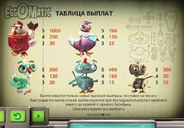 Игровой автомат 3д Эгоматик без регистрации представляет новое поколение аппаратов, как и Гонзо он с сверхкачественной графикой. Перед началом игры рекомендуется посмотреть вступительный ролик, отлично поднимающий настроение. Если производительность компьютера не дает возможности играть в автомат, то в настройках (окошко с ключом слева снизу игрового экрана) нужно вручную изменить качество графики. Количество линий – 20 - изменить нельзя, а у ставки можно изменить не только размер, но и ее номинал. Опробовать игровой автомат EggOmatic можно прямо сейчас, без обязательной регистрации и бесплатно.