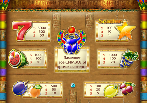 Дикий символ олицетворяет уже знакомый игрокам Жук-скарабей. Один из самых священных символов Египта, он заменяет собой недостающие символы для выигрышной комбинации на линиях и часто приходит на помощь игроку, обходя своим вниманием только символ разброса, о котором стоит рассказать подробнее.