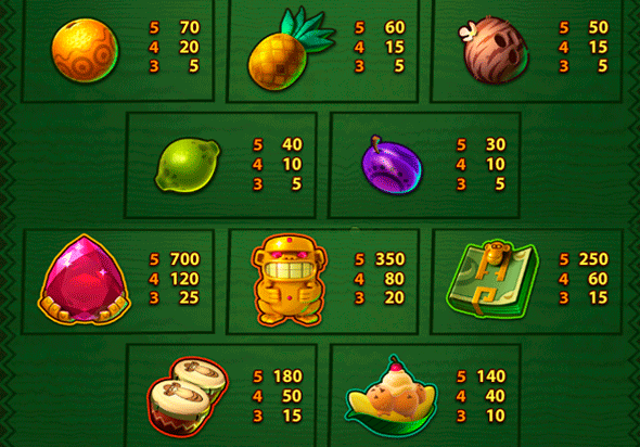Самым дорогостоящим символом этого игрового автомата Go Bananas онлайн можно назвать изображение драгоценного рубина, чьи огромные размеры сулят гемблеру неплохую выплату. Ведь появление пяти таких камешков слева направо на выигрышной линии принесут игроку 700 монет выигрыша.