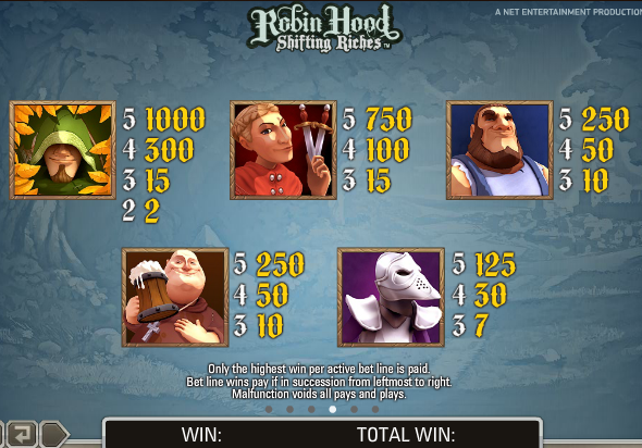 Самая ценная иконка это изображение героя игрового автомата Робина Гуда принесет на счет 2, 15, 300 и 1000 ставок на линию за 2, 3, 4 и 5 символов подряд соответственно. Следом по стоимости идут товарищ разбойника, метающий ножи, а на третье мест разделили бородатый здоровяк и монах, любитель пива