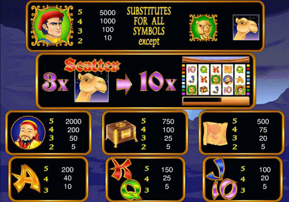 В игровом автомате Марко Поло присутствуют два изображения верблюда, дальше по стоимости картинка мудреца, на четвёртом месте закрытый сундучок, после него раскрытый свиток, арабские буквы, стоимость которых проверяется кнопкой Info. Полученные кредиты можно пытаться удвоить в риск игре, для этого нужно угадать цвет карты, но будьте осторожны, в случае неудачи кредиты сгорят. Удачной игры!