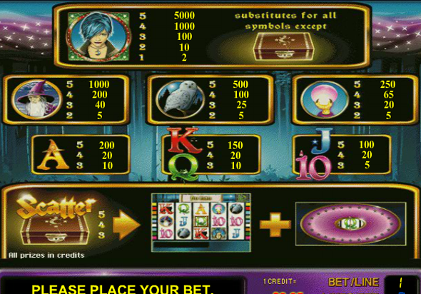 Символ с хозяйкой игрового автомата Магия Денег – симпатичной ведьмой с синими волосами, самый дорогой в игре, приносящий кредиты даже в одиночестве, а за полную линию волшебниц Вы получите джек пот, в 5000 раз превышающий ставку. Кроме этого, он играет роль дикого знака, магическим образом играя в других комбинациях, подменяя и дополняя в них символы.