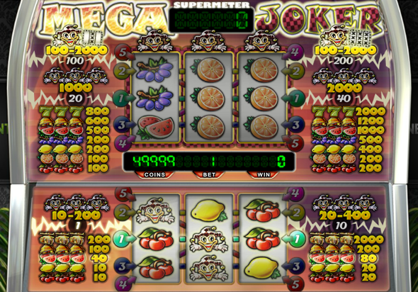 Самый дорогой символ в бесплатном аппарате Mega Joker это изображение счастливой семерки, которая находится на верхнем экране, три таких символа увеличат ставку на линию в 800 раз. На нижнем экране самый желанный и дорогой символ это сундучки с золотом – они максимально умножат ставку в 200 раз.