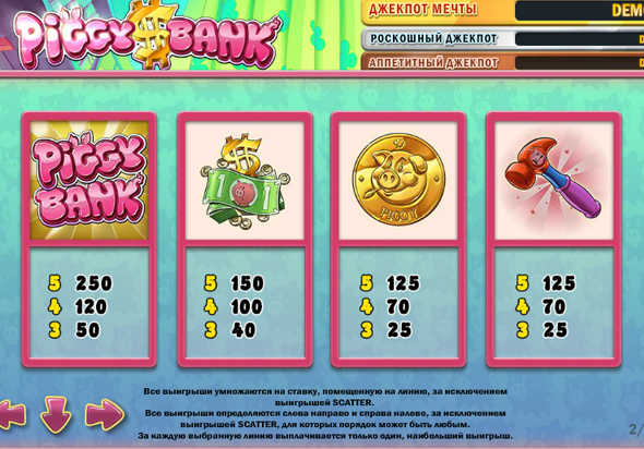 Самый дорогой символ в игре это надпись с названием игрового автомата Piggy Bank, 3 одинаковые изображения подряд по линии увеличат ставку на нее в 50 раз, 4 – в 120, а 5 – в 250 раз. Следом по стоимости идут «свинобаксы», на третьем месте монета «Piggi» и молоток, а самые дешевые, по традиции, карточные символы.