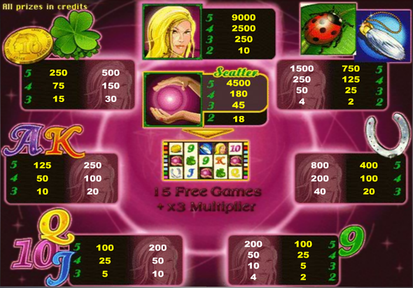 Выигрышными символами игрового автомата Леди Шарм являются разнообразные варианты амулетов, которые приносят Удачу и помогают играть в казино Вулкан на реальные деньги. В правилах слота указано, что главным символом выступает сама Ladys Charm, выполняющая одновременно роль вайлда. Здесь есть и другие изображения, обеспечивающие хорошие призовые: