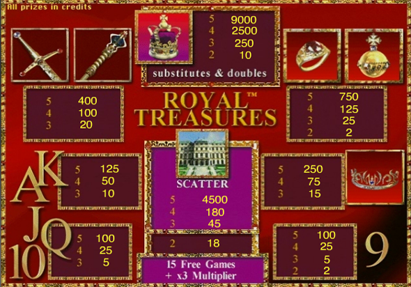 Кажется, все покинули королевство, оставив все сокровища тем, кому они больше нужны. Взять их можно совершенно бесплатно в игровом автомате Королевские Сокровища, который был любезно предоставлен фирмой Novomatic. Невероятные богатства ждут самых смелых и уверенных в себе игроков. Простоту и щедрость игрового аппарата Королевские Сокровища оценит каждый любитель подобных игр, а так же и то, что играть можно без регистрации и надоедливой рекламы.