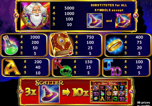 Самый дорогой символ игры изображение Волшебника. В случае выпадения на одну выигрышную линию пяти подобных знаков обязывает счастливчика получить Джекпот и увеличение ставки в 5000 раз. Еще он является диким символом игры, который заменяет все остальные символы кроме изображения шляпы волшебника.