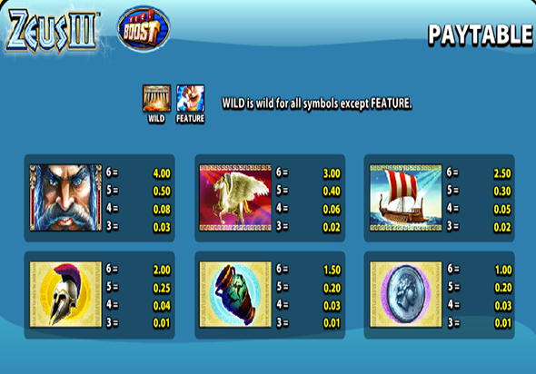 Игрок назначает ставки, нажимает на стартовую клавишу и формирует комбинации из одинаковых картинок, располагая их слева направо. В числе символьного ряда игрового автомата Zeus III онлайн - картинки, иллюстрирующие верховное божество Греции; тяжеловесные монеты - золотые и серебряные; воинская атрибутика; изящная амфора для вина; корабль с поднятыми парусами. В качестве вайлда используется изображение элегантного архитектурного сооружения - небесного дворца Зевса. Дикий символ подменяет рядовые картинки, позволяя создавать максимальное число призовых сочетаний. Разбросанным символом является изображение разряда молнии, которой властной рукой управляет Зевс.